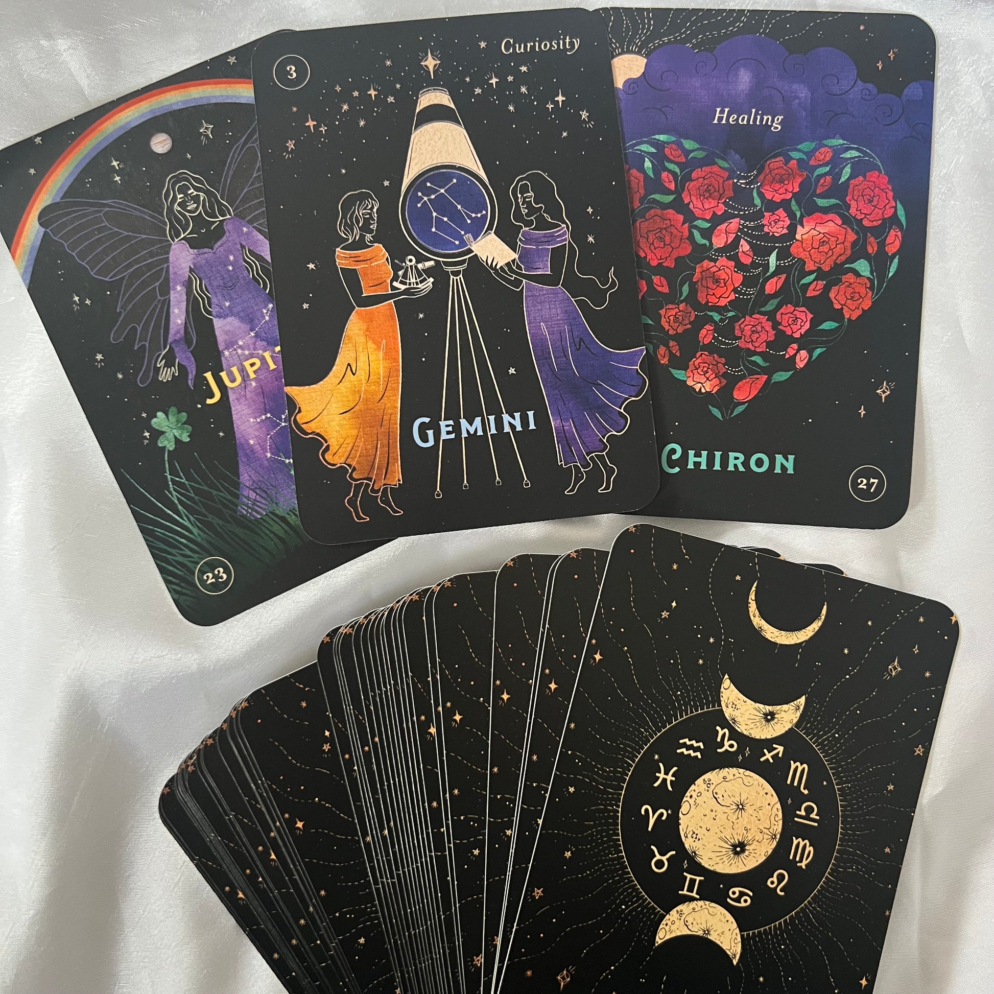 The deck includes cards for the 12 zodiac signs, the four elements, the planets, asteroids, points, and the lunar cycle.