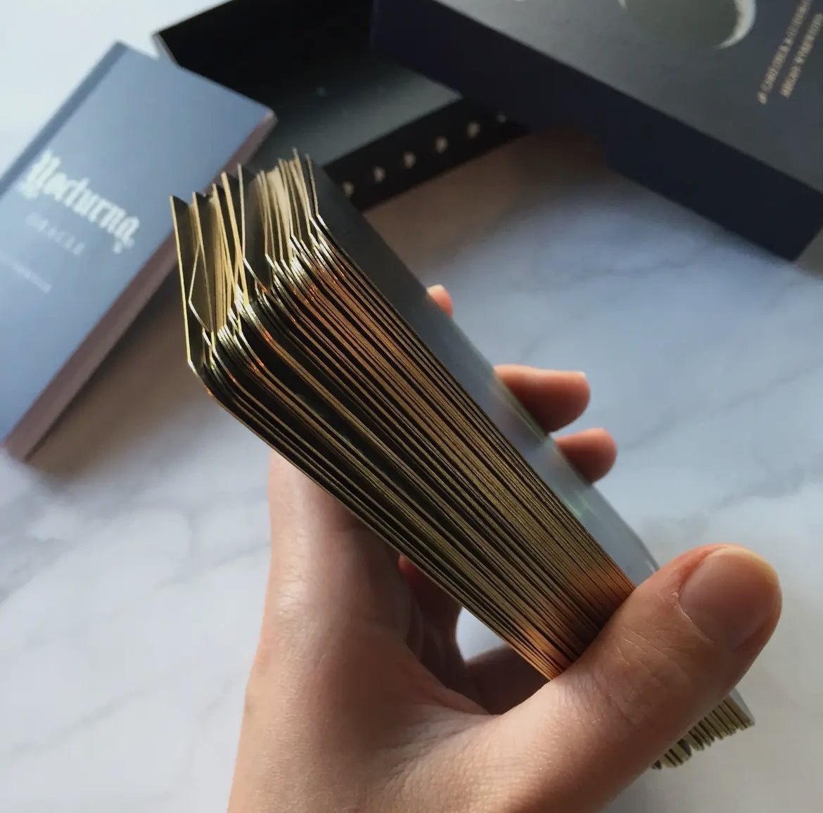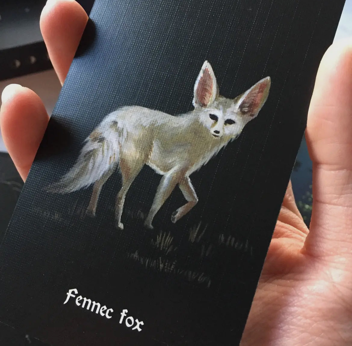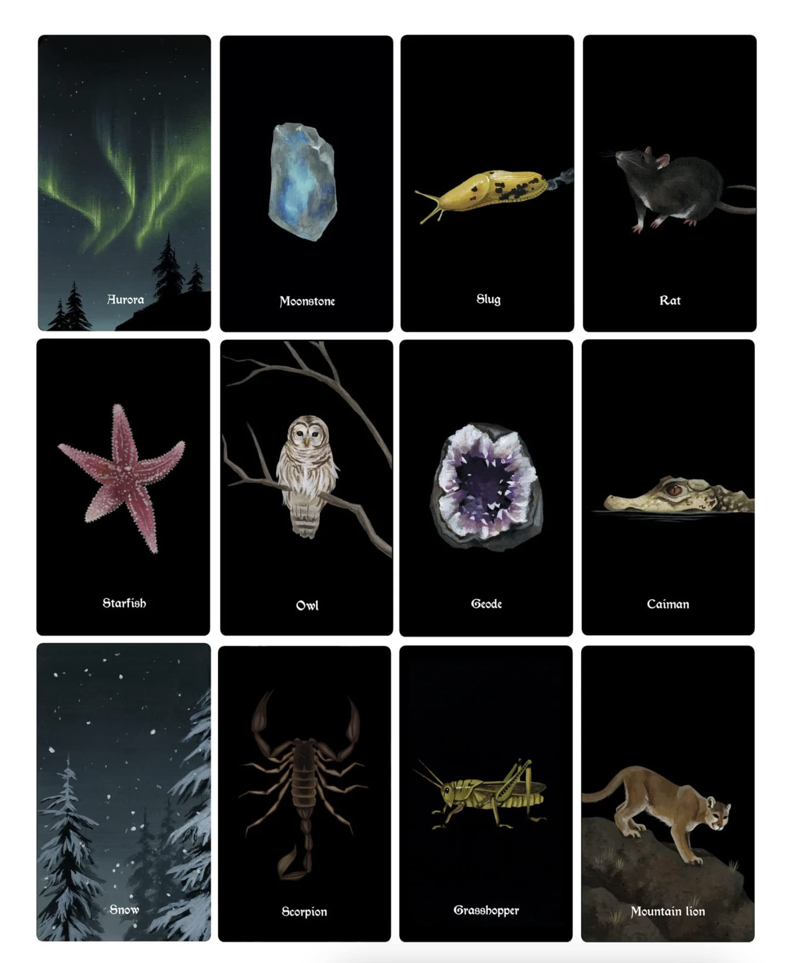 An oracle deck is like a tarot deck, except without a specific structure or archetypes (major arcana, suits, queens etc.). For this deck, the artist chose mostly plants and animals that are active at night. The deck starts with the "dusk" card as the beginning of night, and ends with the "dawn" card, signifying the first light of day.