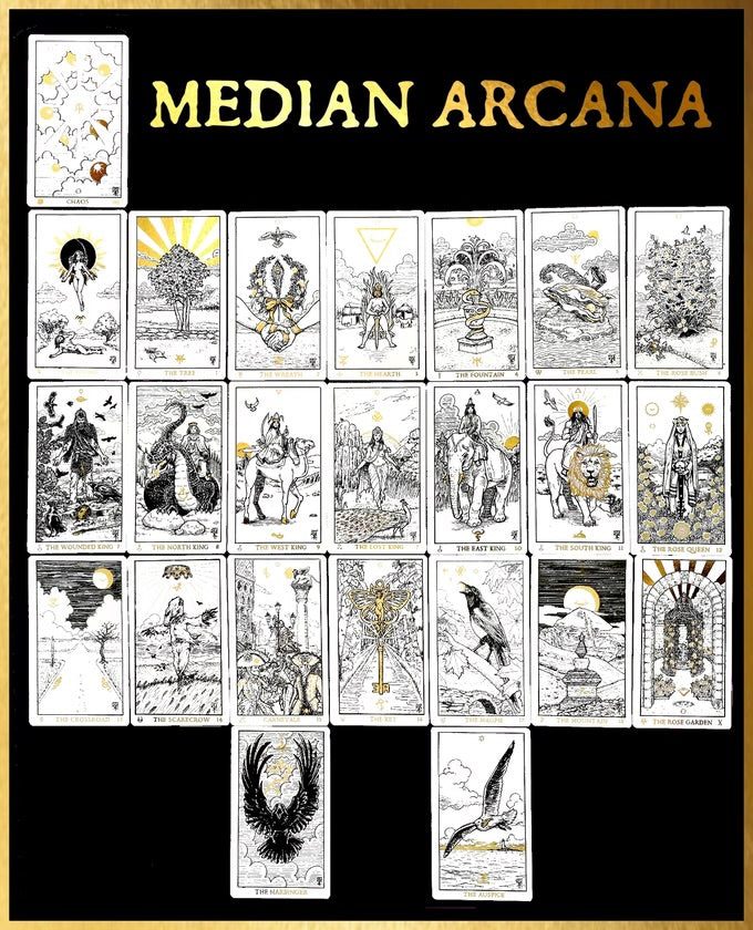 The Median, or Middle, Arcana is built on a journey of a threefold structure, from the unlimited potential of Chaos through the journey of man's place in the world, to the inner journey of spiritual alchemy represented by the Kings, to the last part of the inner world manifest in the outer world and the journey of overturning previous knowledge to reach a higher level of enlightenment. This is a psychological companion to the spiritual journey found in the Major Arcana.