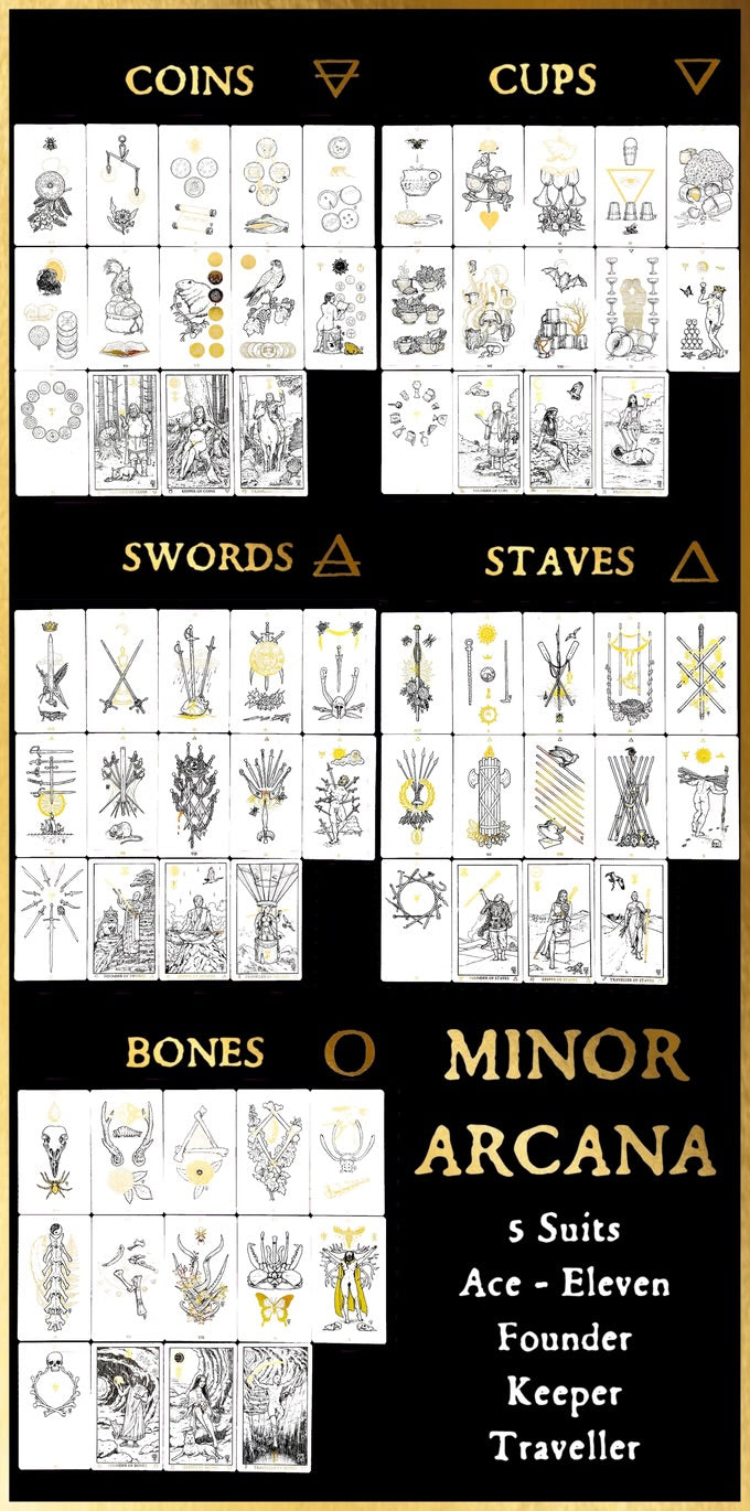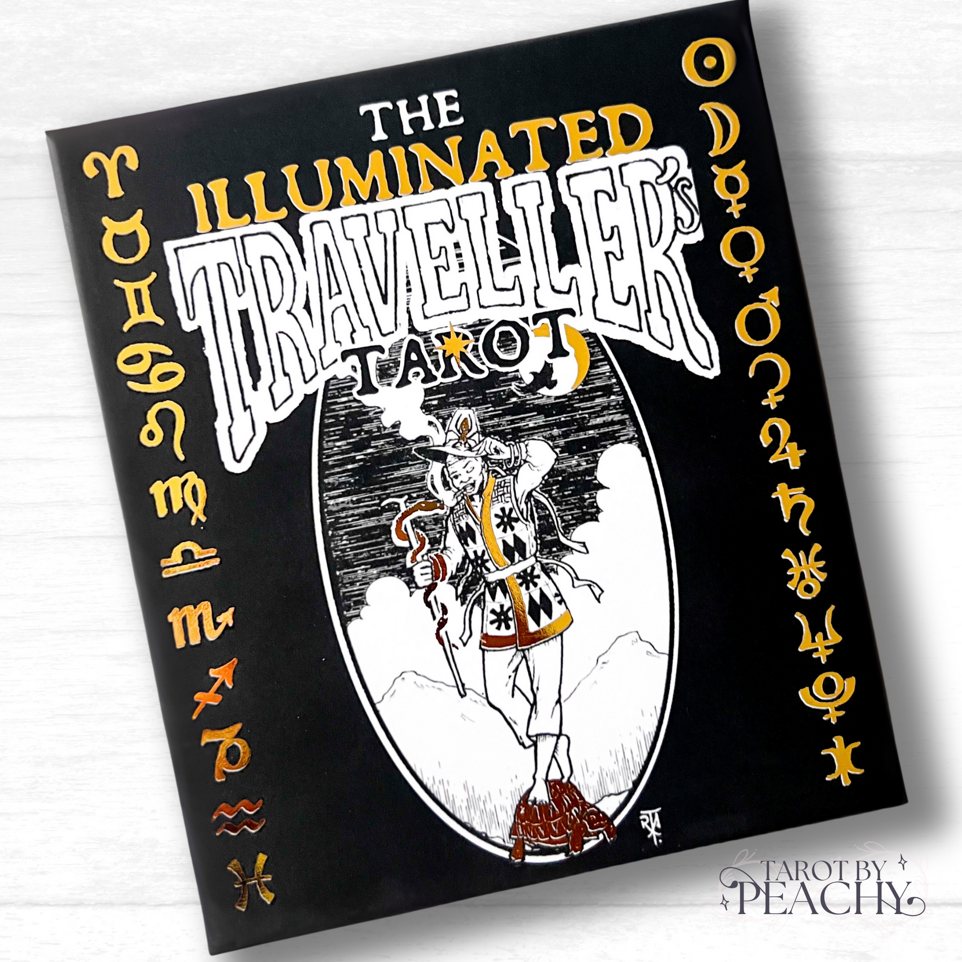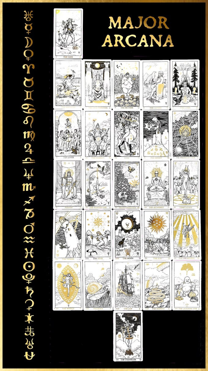 The Illuminated Traveller's Tarot is an exclusive black, white and gold tarot deck of 154 cards, with gilded edges.